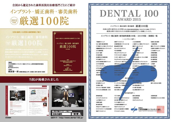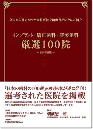 「インプラント・矯正歯科・審美歯科 厳選100院」の2015年版に掲載されている100院の中で、当院が「インプラント部門」に認定されて書籍に掲載されました。